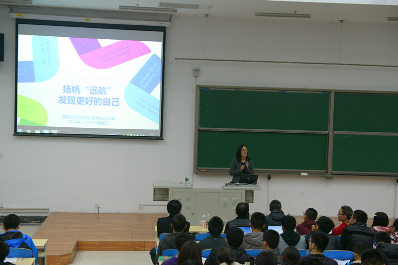 宣讲中,吕莹老师分享了海外学习、跨文化交流对于大学生成长所能起到的重要作用、海外学习经历将会带给我们怎样的职业生涯优势,以及对我们的生活产生哪些积极影响。她还列举了几位北航校友通过远航计划在海外成功求学的例子,鼓励同学们抓住这样难得的机会多走出去看一看,同时也希望同学们在语言、心理、生活等各方面做好充分的准备。接下来,高源老师就正在进行的2015-2016学年秋季学期校级学生交换项目/双学位项目选派工作的具体问题给大家做了详细的介绍。远航计划中有很多项目可供同学们进行选择,包括学生海外交换、交流、暑期学校、优秀奖学金计划等。他同样为我们介绍了同学们关注的住宿、生活费、学分转换等实际问题的情况,让同学们对出国学习有了一个全面的了解。同时,高源老师也指出了出国学习的申请条件,特别强调的是语言要求的问题,希望同学们能够尽快通过相关考试,为海外学习做好准备。