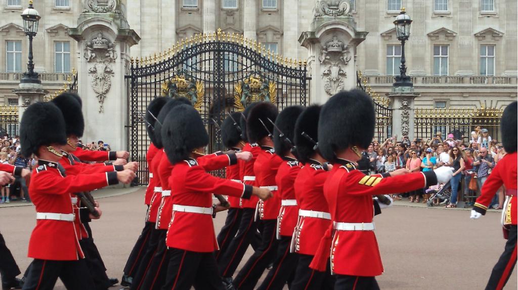 那么接下来的游览,更是让我激动不已。为了让大家能够有机会了解英国的历史文化、感受伦敦作为英国政治文化中心的城市氛围,丁老师首先带领我们观看了伦敦白金汉宫的皇家卫队交接仪式。上午11点30分,仪式开始,头戴黑熊皮帽、身着正红上衣的皇家卫队步伐铿锵,整个换岗仪式秩序井然、威严庄重,从中可以感受到历史悠久的大英帝国对传统制度的沿袭。好似天安门的升旗仪式,这个仪式也带有象征着国家威仪的意味。