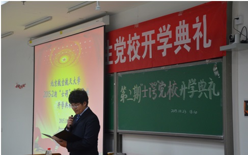 10月23日晚, 2015-2期“士谔”学生党校开学典礼在沙河校区教3-410教室隆重召开,仪器科学与光电工程学院党委书记赵慧洁教授出席并讲授了第一堂党课。出席开学典礼的嘉宾还有来自8、14、15、17系的各位辅导员老师。党校总干事孔子宁主持了开学典礼,2015-2期“士谔”学生党校全体学生干部和学员参加了开学典礼。