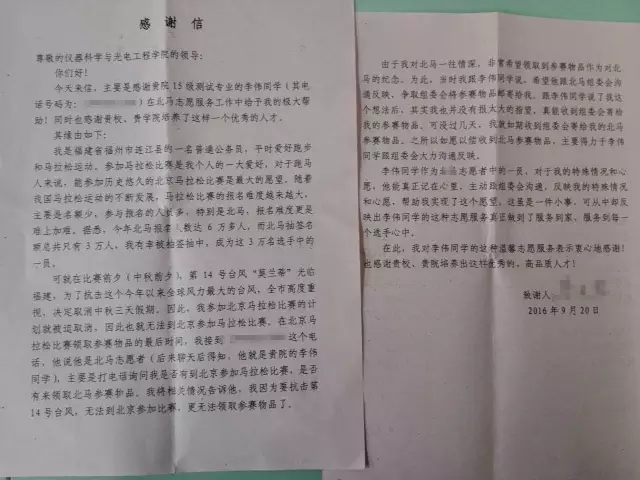 在上个月举办的北京马拉松比赛中,李伟同学连续三天作为赛前志愿者,为前来参赛的选手分发衣服和号码牌。随着志愿活动接近尾声,李伟同学发现还有几名参赛者未按时领取衣物。在其他组都未打电话的情况下,他主动打电话联系参赛者。一位来自福建对北马一往情深的参赛者向李伟表示,由于要抗击台风不能前来参加比赛。当得知他希望能得到参赛的物品作为纪念时,李伟及时与北京马拉松组委会的负责人进行联系。组委会在得知相关情况后,将北京马拉松参赛物品寄到参赛者家中。不久之后,这名参赛者写了一封感谢信寄到我院。在信中,参赛者衷心感谢、佩服李伟同学的行为,并对我校、我院的教育表示感谢。说到这,李伟笑着说“这事没啥”,“这是小事”。乐于助人对他来说已是再平常不过的小事,但对这名马拉松热爱者却有着不一样的意义。