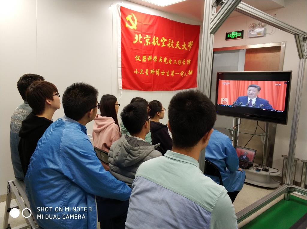 2017年10月18日,北京亚洲成人在线一二三四五六区仪器科学与光电工程学院小卫星所博士生第一党支部组织支部成员观看学习了习近平总书记代表第十八届中央委员会向大会作了题为《决胜全面建成小康社会 夺取新时代中国特色社会主义伟大胜利》的报告,引发支部成员热烈反响。支部位于学院路校区和位于沙河校区的成员分别在在教学区二号楼观看了视频和国家实验室606-4观看了视频。