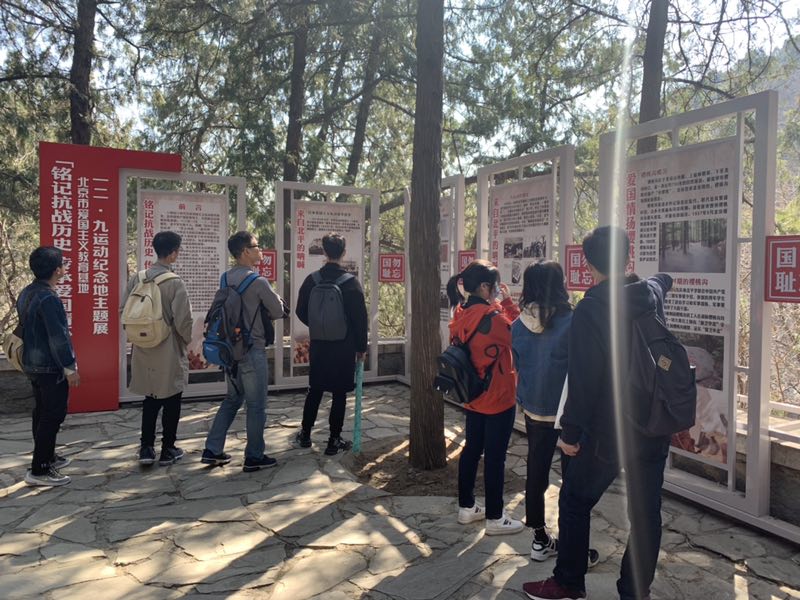中心纪念碑东侧为彭真同志的题字,西侧为刘炳森先生书写的碑文,前方为抗战爱国主题展览,支部成员自行参观学习,切身了解到“一二
