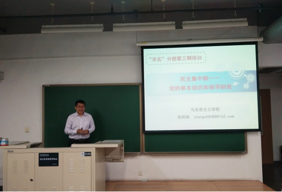 此次培训会的主题是《民主集中制—党的根本组织和领导制度》,张树焕老师就民主集中制主要讲解了三部分内容:第一是民主集中制在党章中的演变历程,张老师通过列举陆定、陈独秀等人的事例和各个年代党章中民主集中制的章节内容,详细讲解了民主集中制的萌芽和出现、概念原则的初步表述及基本规范、曲折、有限恢复、全面恢复和进一步发展;第二是关于民主集中制的几个问题,张老师从国际共产主义与民主集中制、如何看待“四个服从”的关系、“少数服从多数”或“服从正确意见”三个问题进行了阐述;第三是如何贯彻民主集中制,这部分中张老师还对比介绍了民主集中制和首长负责制的异同。在培训过程中,张老师以幽默诙谐的语言和丰富充实的内容赢得了全体成员的一次次掌声。