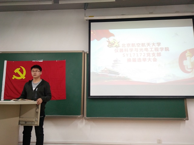 月23日下午,仪器科学与光电工程学院SY17172党支部严格按照党支部换届工作流程,召开全体党员会议,顺利地完成了支部换届选举工作。此次会议由组织委员熊凯主持。